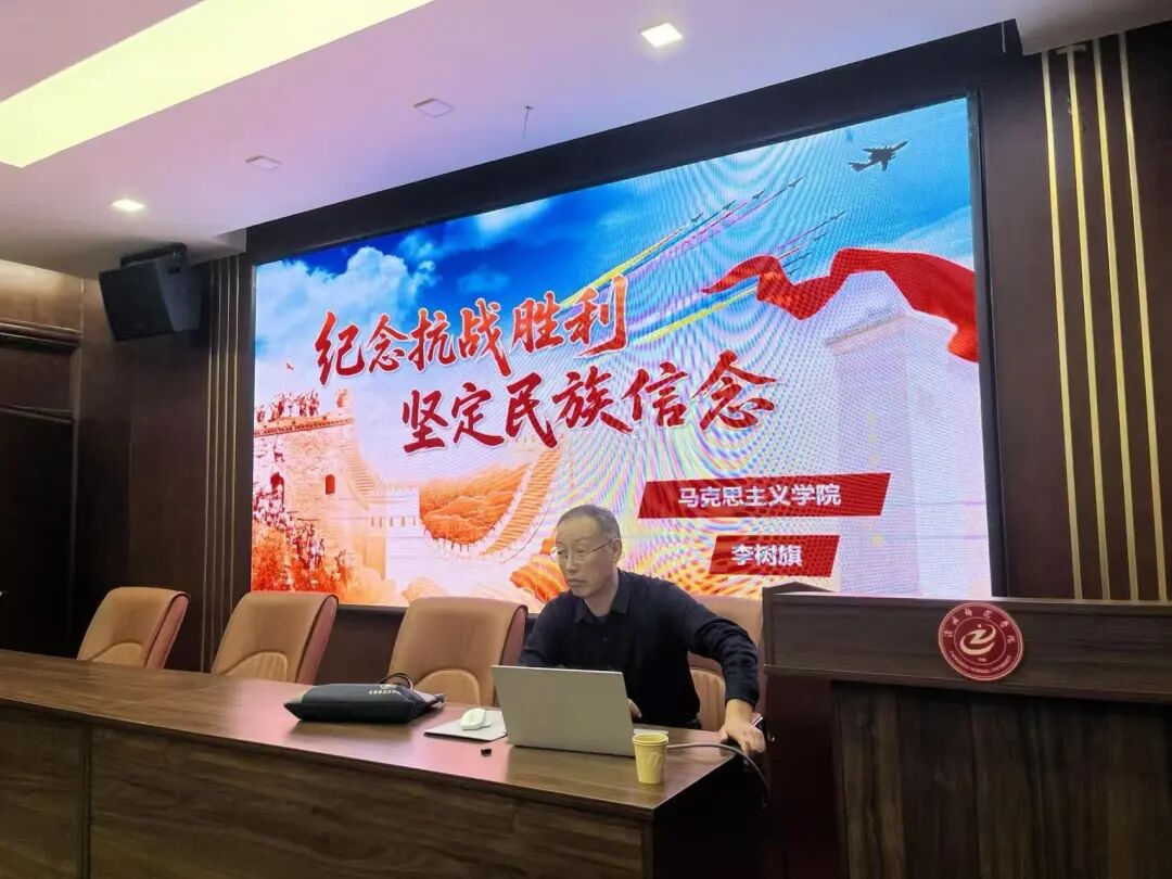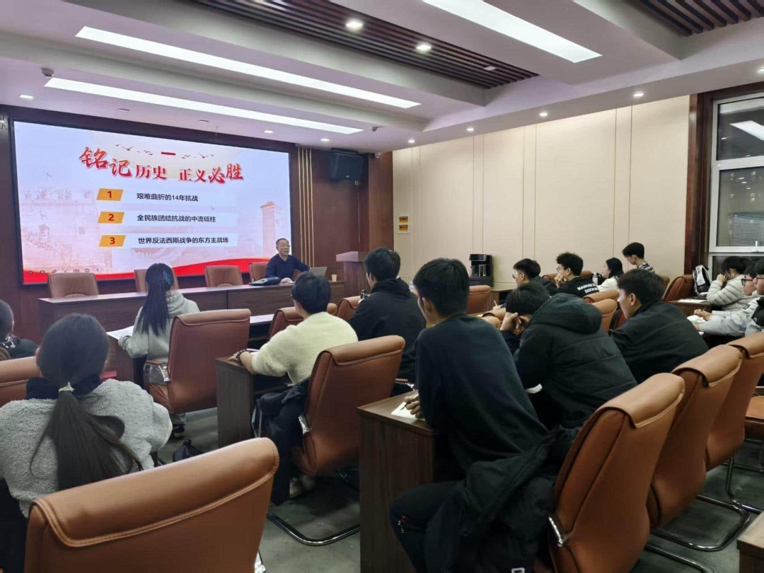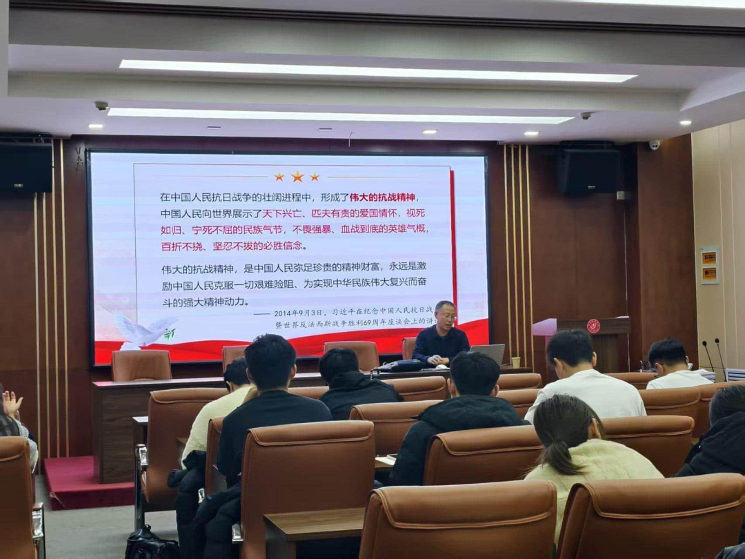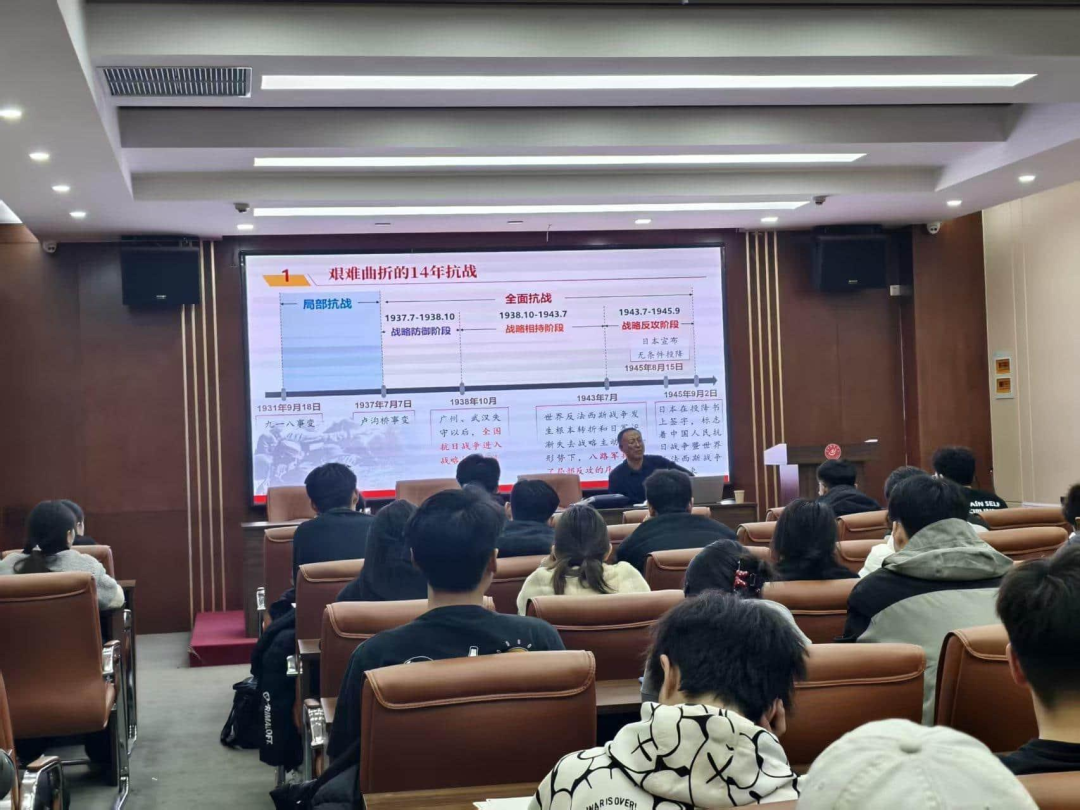 李院长以“抗战胜利,坚定民族信念”为核心,先结合党的二十届四中全会与“十五五”规划精神铺垫时代背景,再以局部抗战和全面抗战为主线,通过九一八事变、卢沟桥事变、百团大战等具体事件展开讲解。他阐述了中国作为东方抗日主战场对国际反法西斯战争的巨大贡献,及其制止日本“北进”“南进”计划的关键作用,并以杨靖宇等革命先烈为例,解读了视死如归、宁死不屈的民族气节,传递人类命运共同体理念。互动环节中,同学们积极提问应答,现场氛围十分热烈。