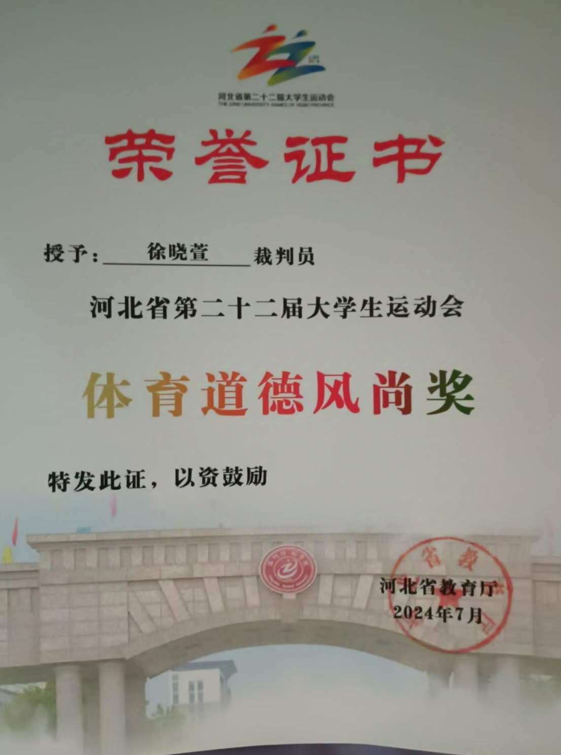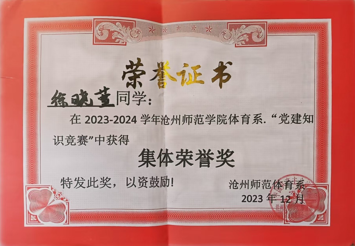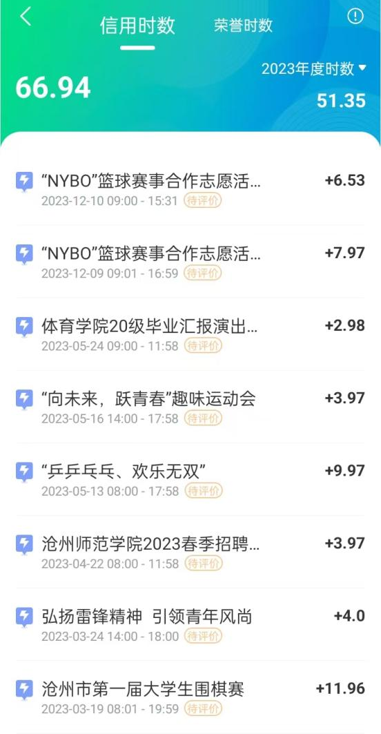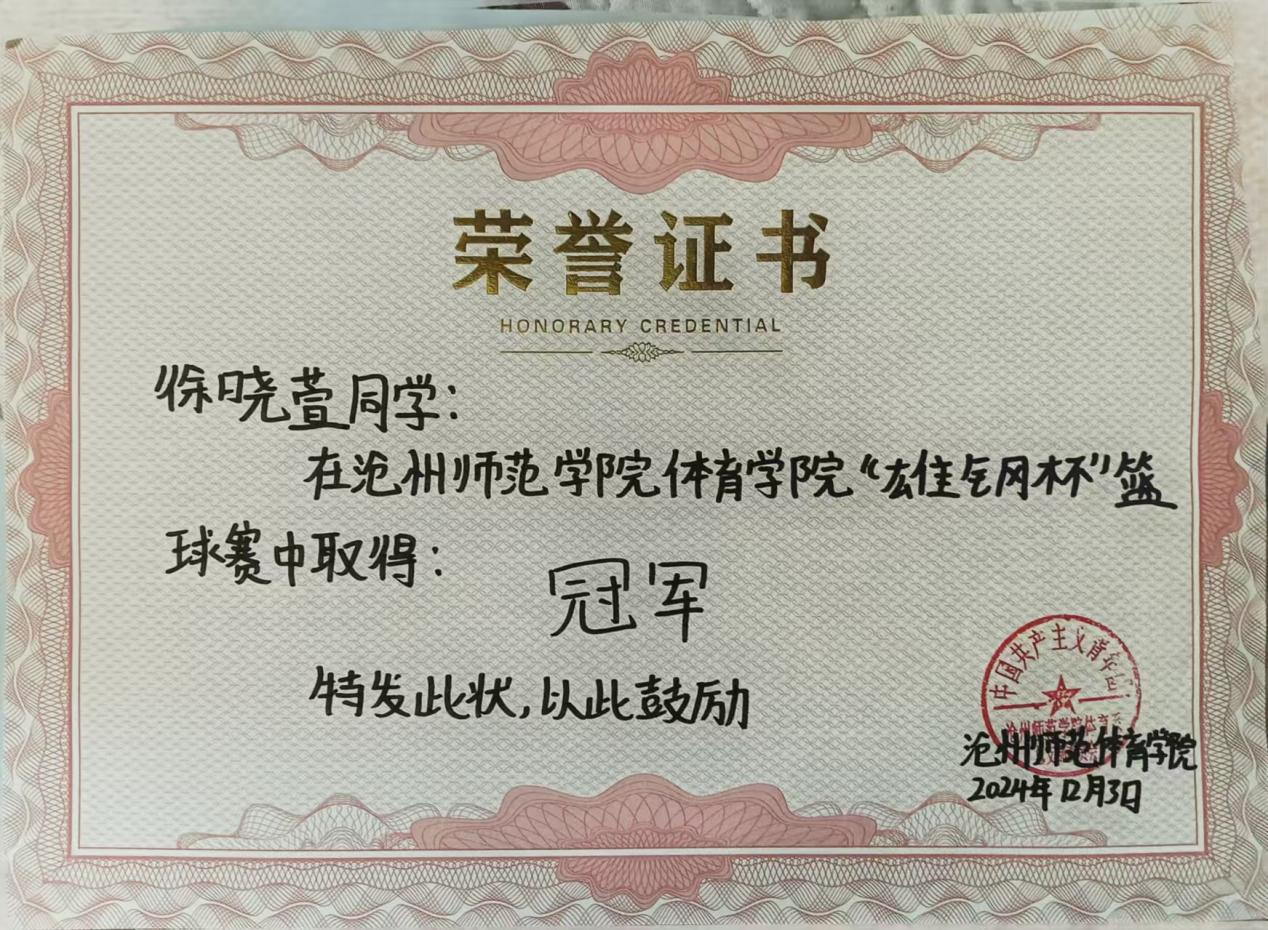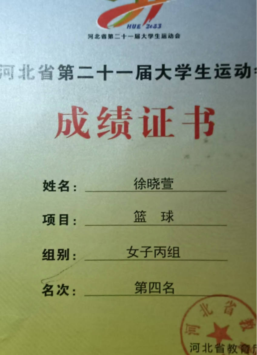 在生活中,徐晓萱同学积极参加各种实践活动,丰富自己的课余时间。在2023年邯郸举行的河北省第二十一届大学生运动会中获得女子组篮球第四名,在本校沧州师范学院举行的河北省第二十二届大学生运动会中获得了裁判员的体育道德风尚奖;自开学以来的志愿时长已经达到了154.92小时。
