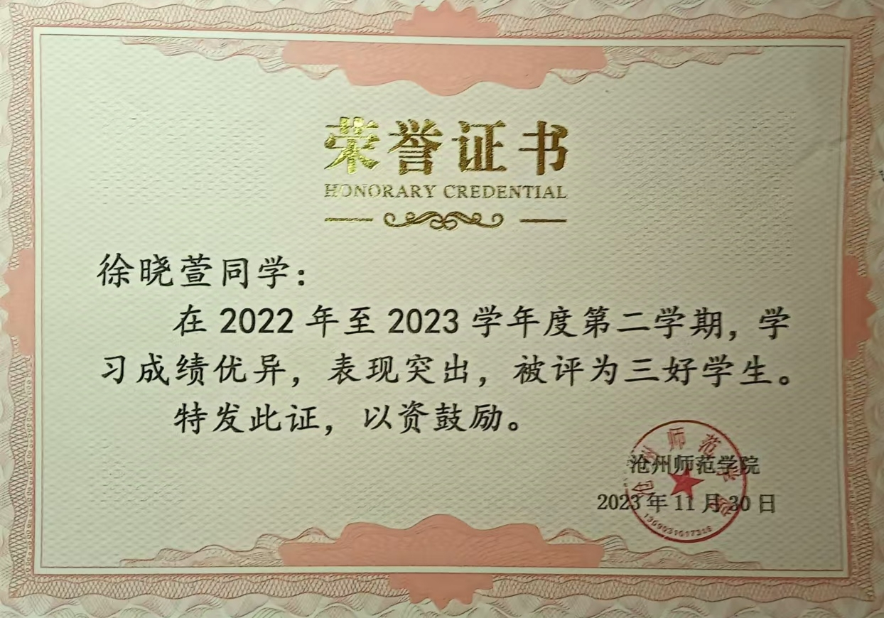 在学习中,徐晓萱同学勤奋刻苦,取得较好成绩。第一学期总成绩排名全年级第11名,第二学期总成绩排名全年级第二, 班级排名第一。第一学年年级总排名第二名。大一学期总成绩排名全年级第七名,大二总成绩排名年级第三、班级第一;大一大二两学年总成绩全年级排名第三名;大二获得了国家励志奖学金和三好学生称号。