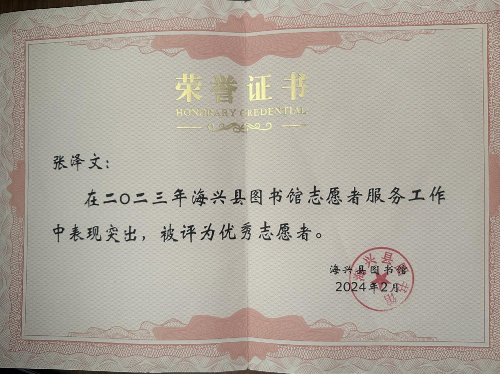 2023年11月在海兴县图书馆评为“优秀志愿者”