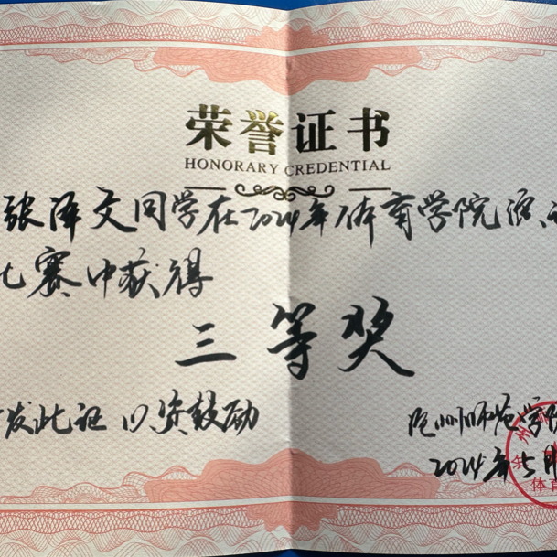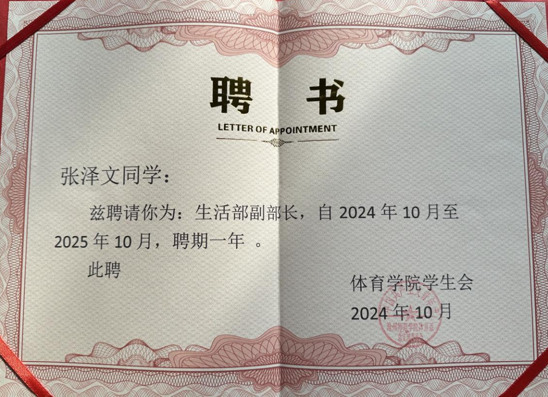 张泽文,共青团员,体育学院2023级体育教育四班班长,现担任生活部副部长。